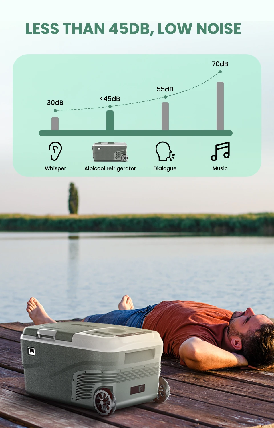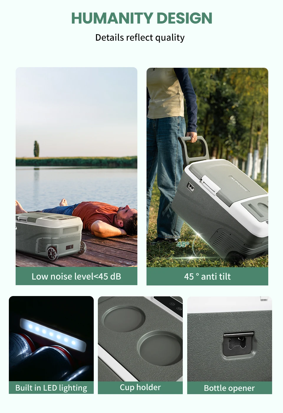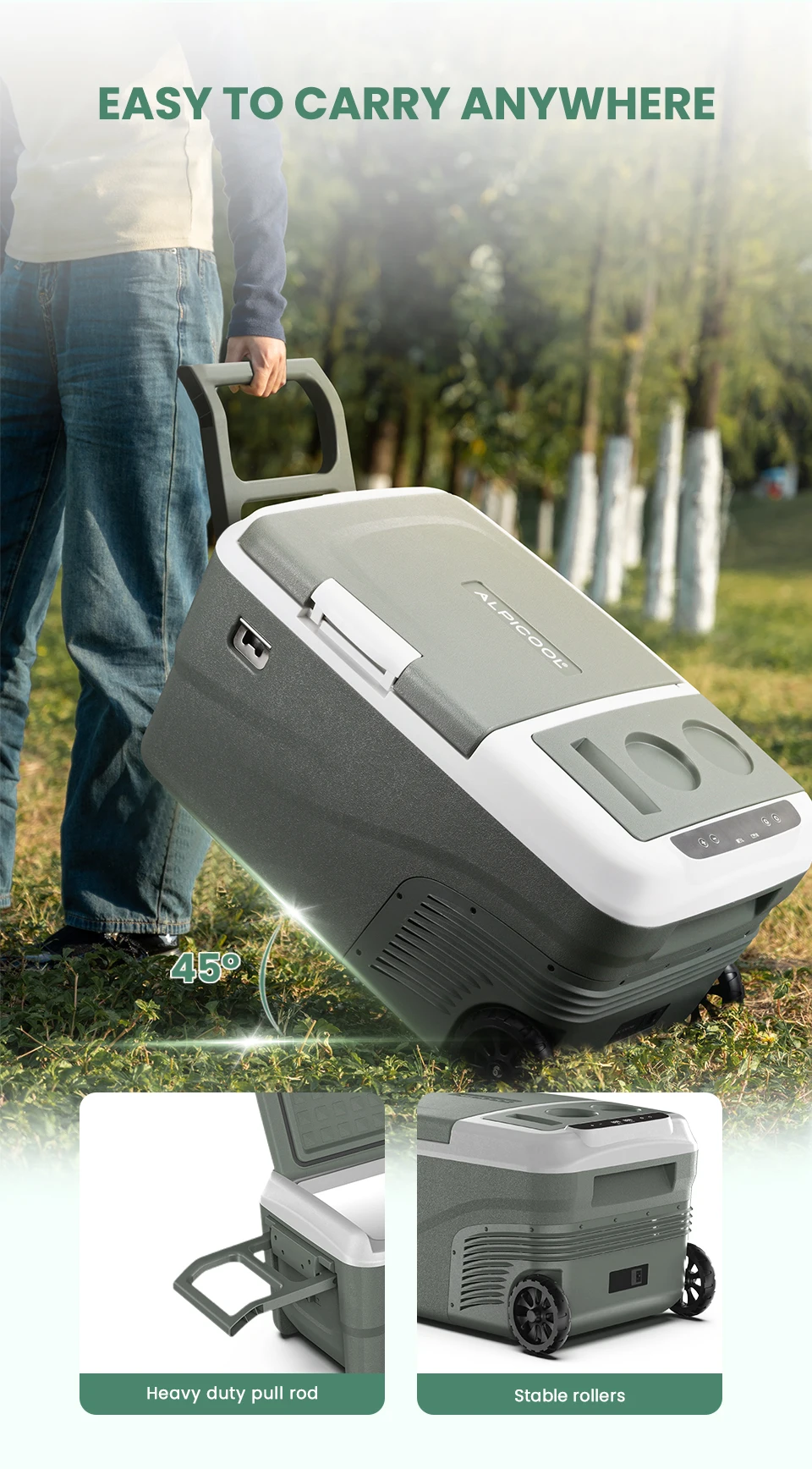 تحتوي الثلاجة المحمولة من سلسلة alpicol D على عجلات وتصميم رافعة ، لذلك لن تضطر إلى حملها ، مما يوفر الوقت والطاقة. 45 درجة مضادة للإمالة ، لا تقلق بشأن الرحلة الوعرة مرة أخرى. ضوء LED مدمج ، سهل الاستخدام دون خوف من الظلام. أقل من 45 درجة ديسيبل تشغيل صامت ، لن يزعج راحتك. حامل الأكواب على سطح الباب يجعل المشروب لا يميل. بالإضافة إلى ذلك ، هناك أيضًا فتاحة زجاجات ، صخب عشاق المشروبات ، يشرب في أي وقت وفي أي مكان!