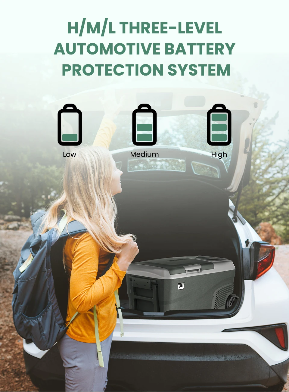 تم بناء ثلاجة السيارة Alpicool 12 فولت في نظام حماية 3 مستويات H/M/L. يمكن للنظام أن يتوافق مع جهد بدء مختلف وجهد إيقاف التشغيل على التوالي. عندما تكون بطارية السيارة منخفضة ، تتوقف الثلاجة عن العمل لحماية بطارية السيارة ، وبالتالي تمنع قوة السيارة من التحميل الزائد أو قصر الدائرة ، مما يطول عمر خدمة بطارية السيارة ، بالإضافة إلى حماية سيارتك.